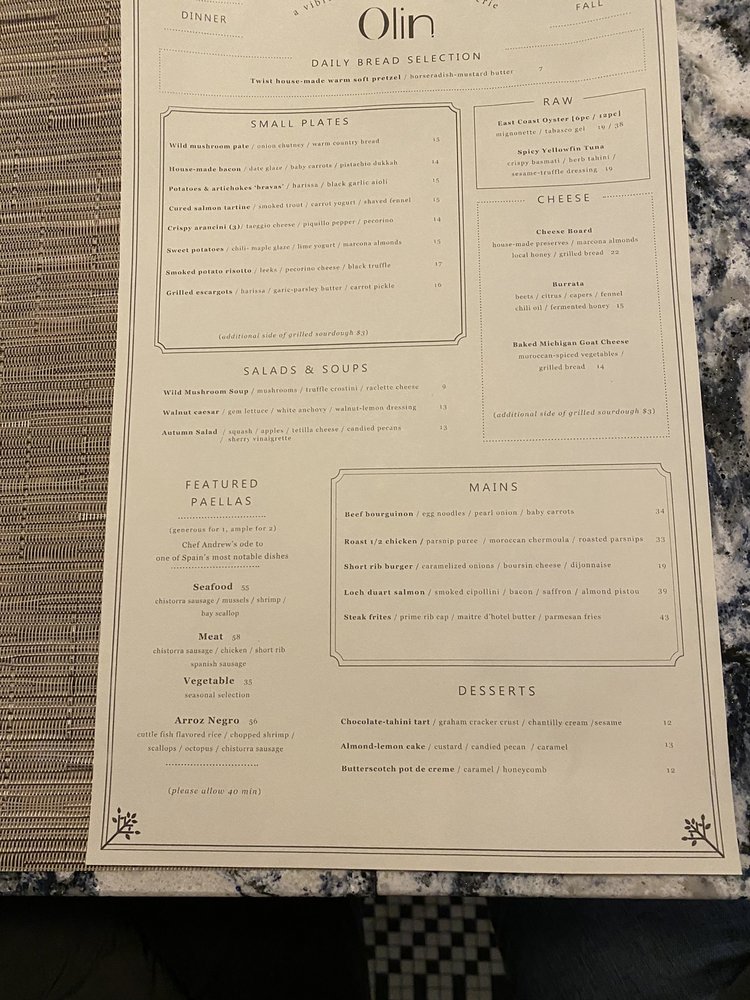 Introducing the menu at Olin Bar & Kitchen, located in Detroit, MI, offers a diverse selection of tapas and small plates in the New American cuisine category. With options for vegan diners, this establishment provides a casual yet classy dining experience, perfect for groups or a dinner outing. The restaurant offers valet parking, garage parking, and street parking for convenience. Customers rave about the short rib burger, Caesar salad, poached pear salad, and steak frites. Positive reviews highlight the excellent service, fresh and homemade food, and standout dishes such as the swordfish, burger, and shrimp pasta. While some reviewers noted smaller portions and higher prices for certain items, the overall experience at Olin Bar & Kitchen is praised for its friendly staff and modern design, making it a great choice for a date night or small group gathering.